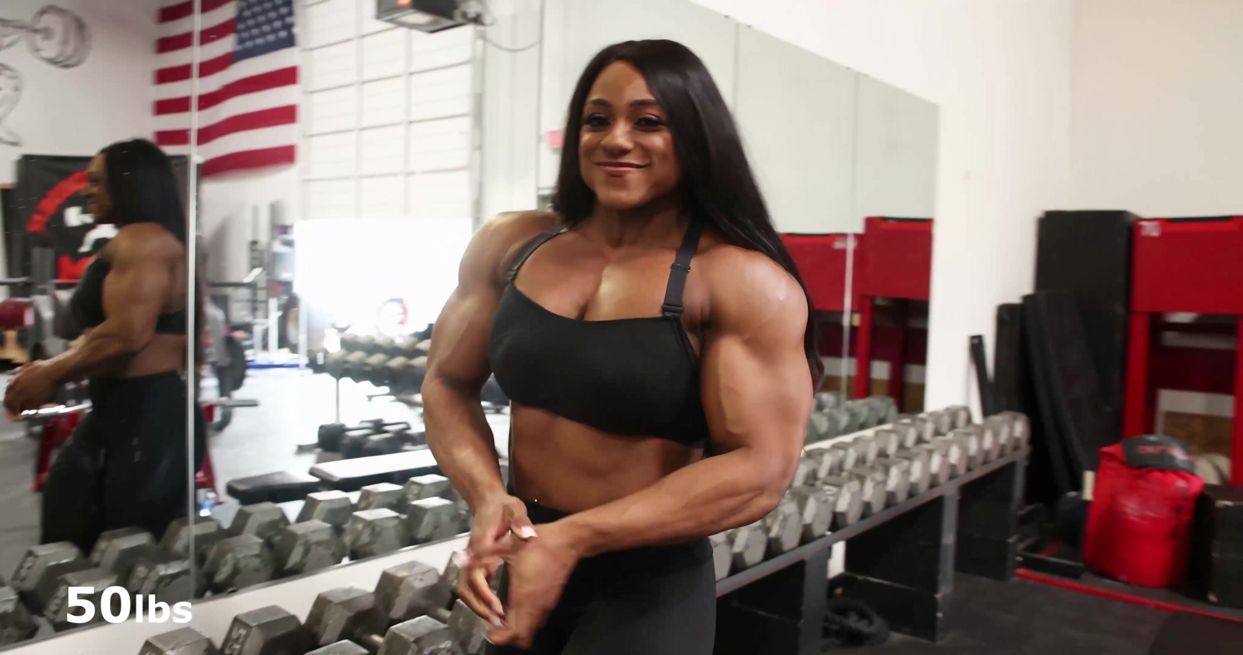 Humongous black female ebony muscle Sheena Wash bursting through shirt